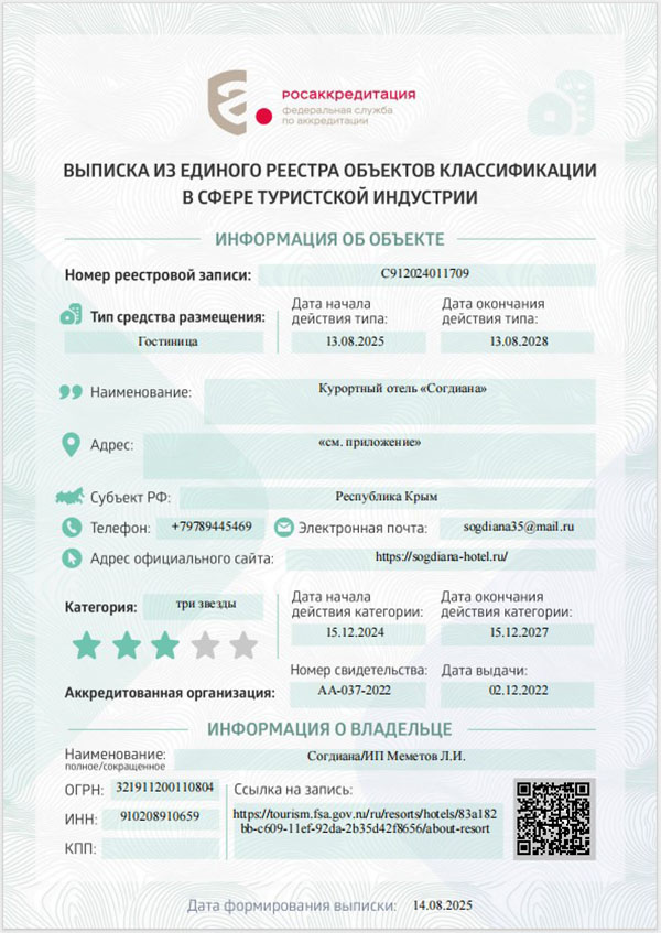 Маленькие уютные гостевые дома, роскошные отели класса «люкс», санатории, виллы — вариантов снять жилье в Николаевке с разными расценками, номерами и дополнительными услугами действительно немало. Но среди этого многообразия одним из лучших вариантов будет отель 3 звезды «Согдиана». При этом наш отель прошел официальную аккредитацию и имеет все подтверждающие документы, что гарантирует вам безопасный и комфортный отдых.